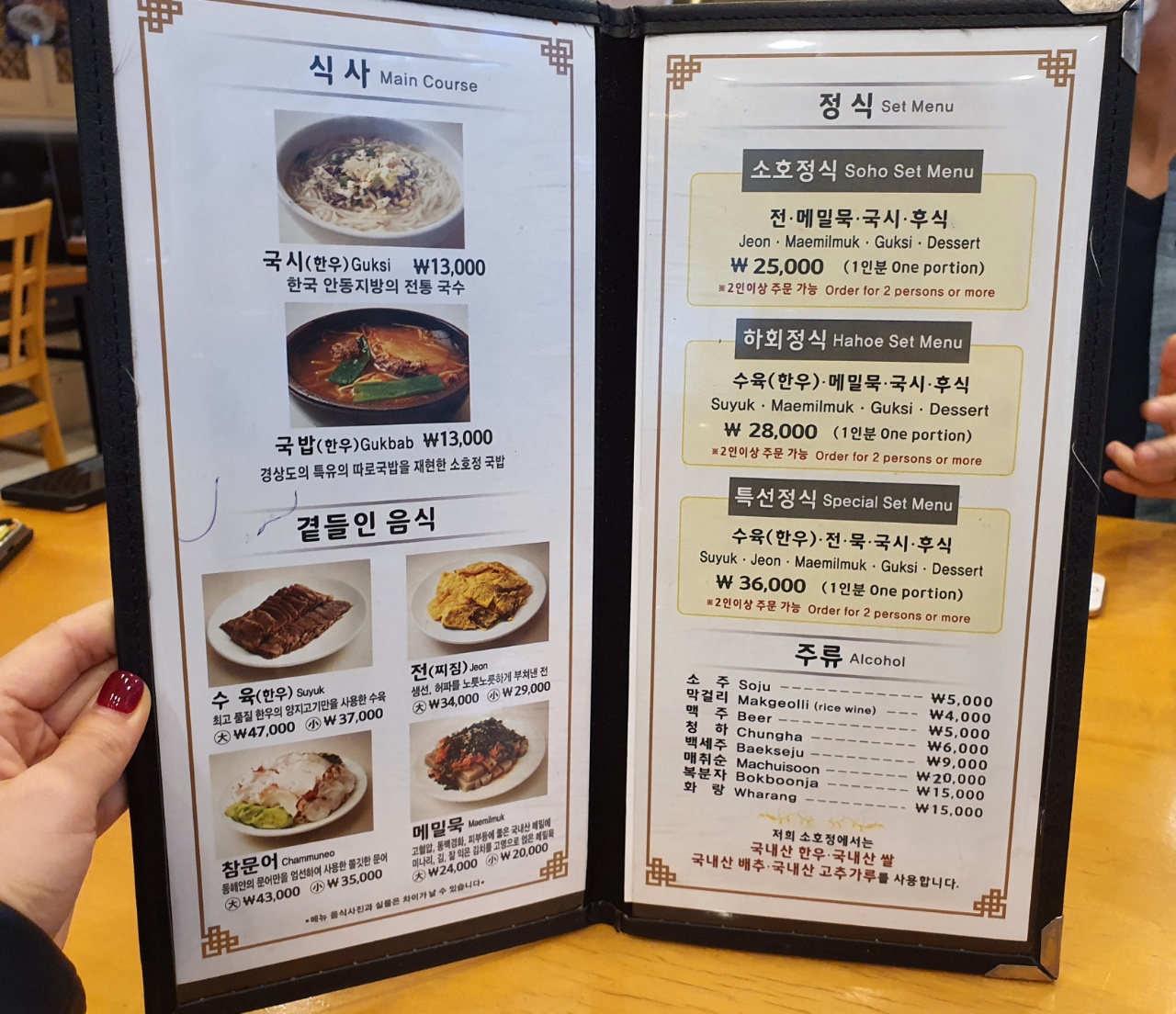 소호정에서 유명한 두가지 메뉴 국시랑 국밥을 주문하기로 했습니다.